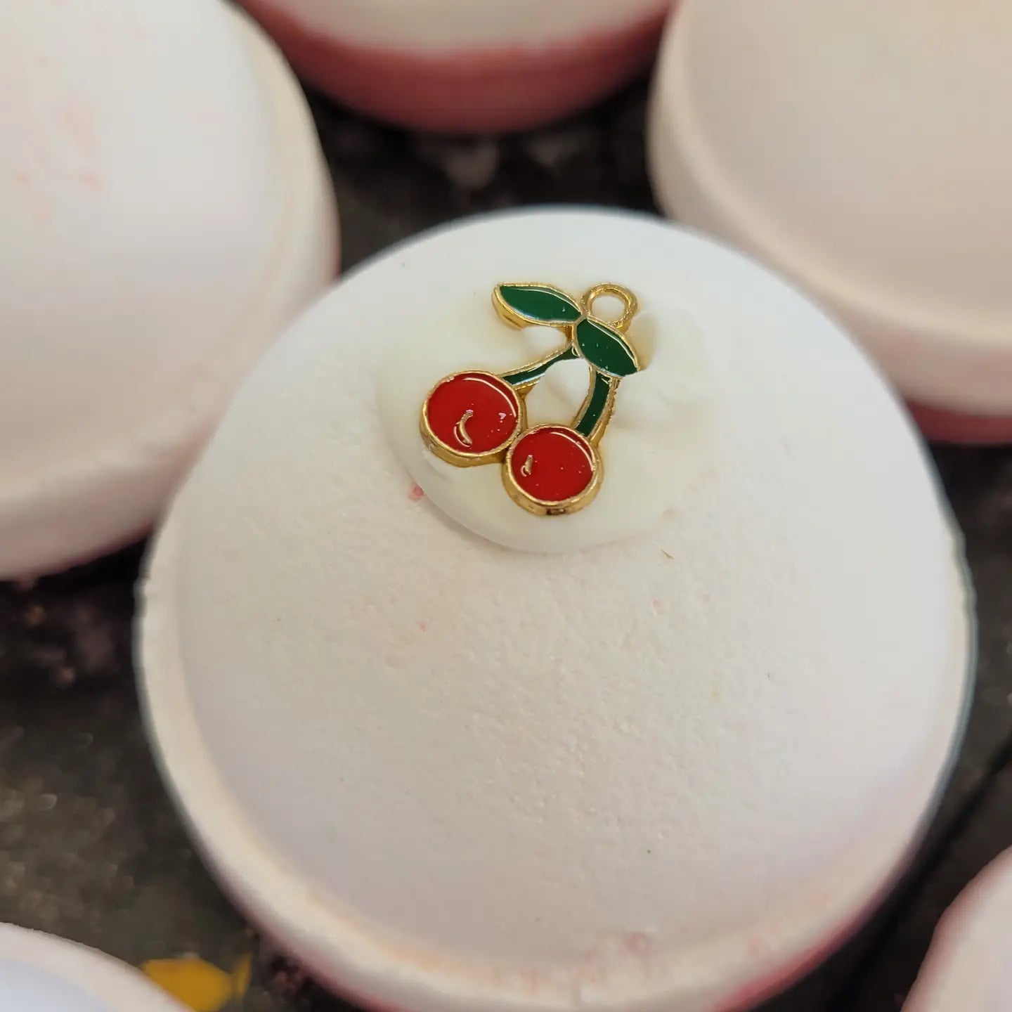 Cette bombe de bain blanche et rose est décorée à la main avec du beurre de cacao et est accompagnée d'un charmant pendentif cerise. Végan, sans cruauté cette jolie bombe de bain est parfumée avec une fragrance de granité à la cerise.